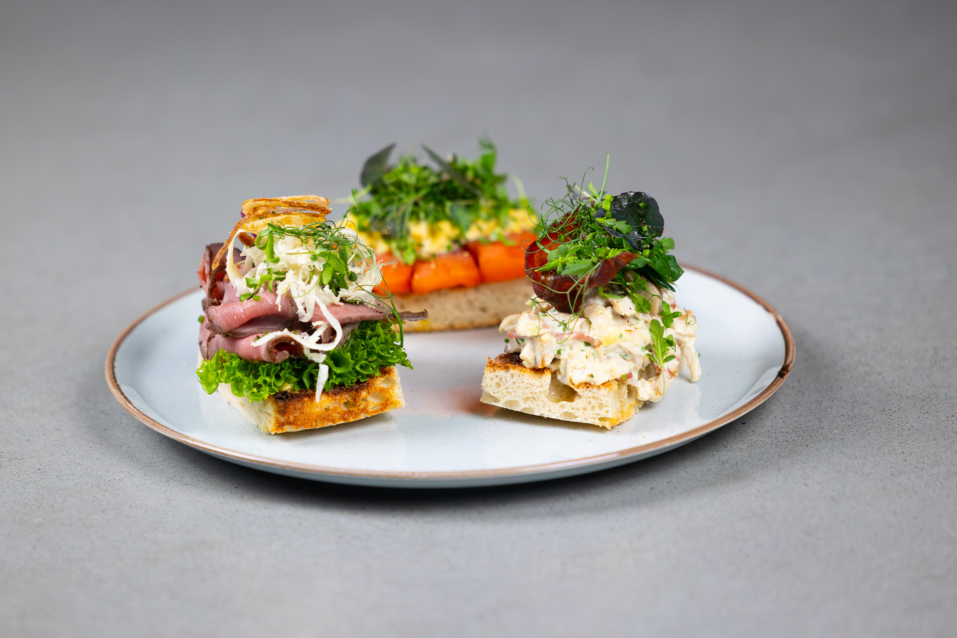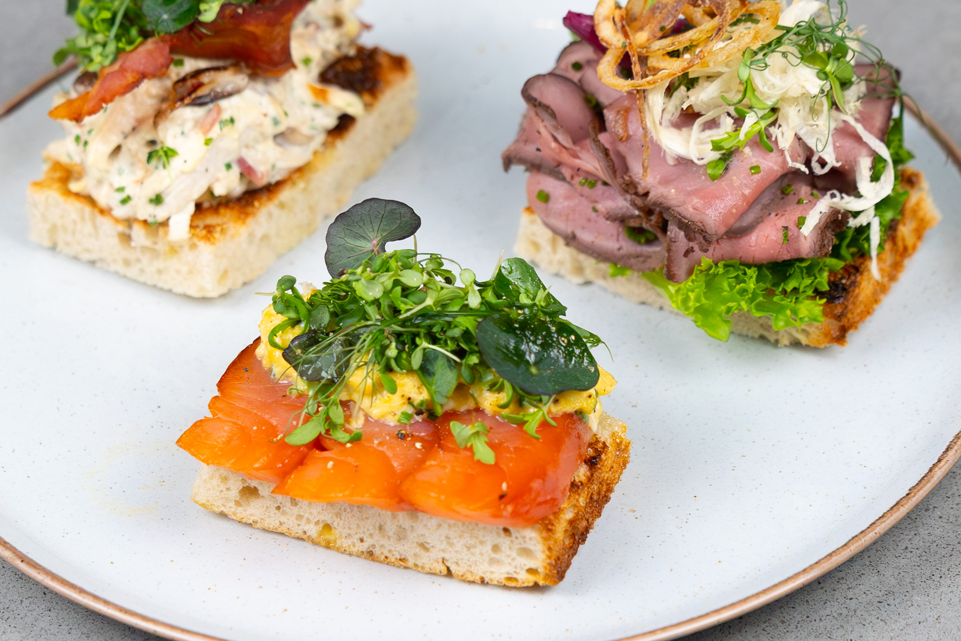 Smørrebrødene består av ferskt kvalitetsbrød, ekte smør, lokale råvarer fra både hav og land, og klassiske kombinasjoner med moderne detaljer. Hvert smørrebrød er laget for hånd – enkelt, elegant og fullt av smak.