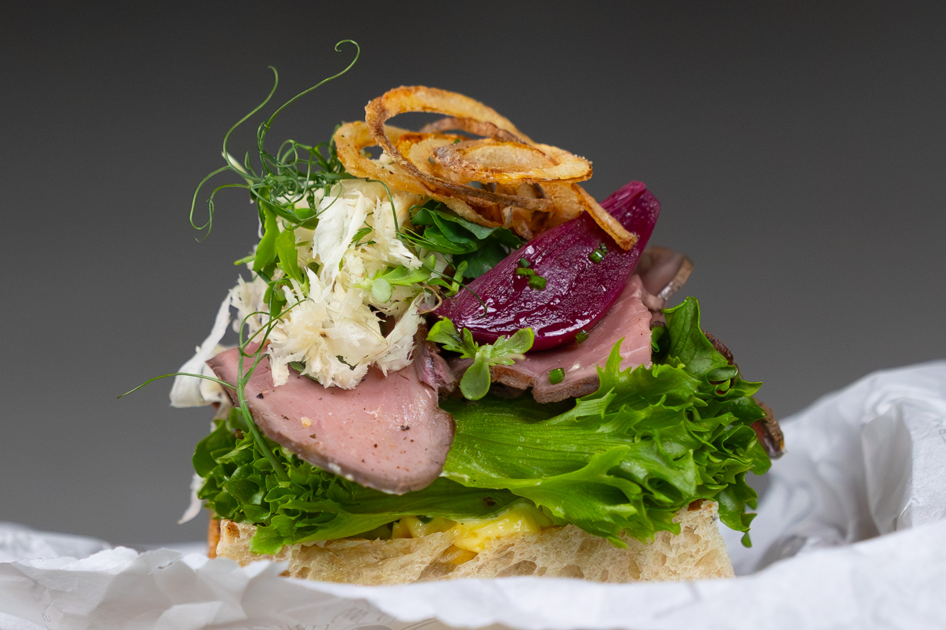 - Roastbiff med grov remulade, syltet agurk og pepperrot