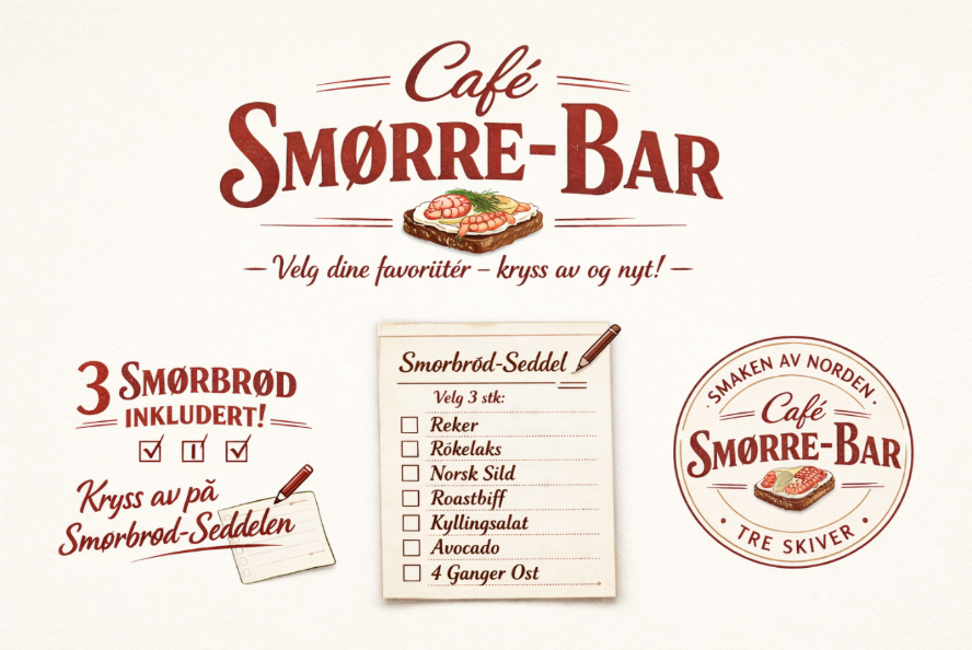 Når du besøker Smørrebrød-kafé får du oppleve den gode, gamle smørbrødtradisjonen på ekte vis. Ved ankomst får du utdelt en gammeldags smørrebrød-seddel, der du krysser av hvilke tre smørrebrød du ønsker deg, akkurat slik man fortsatt gjør på klassiske smørrebrød-kaféer i København.